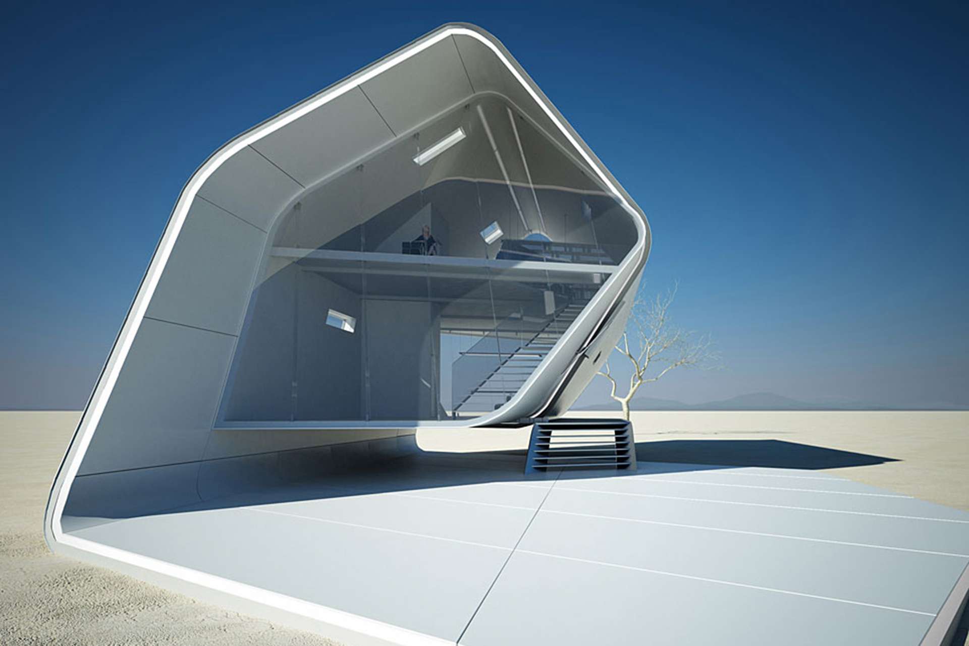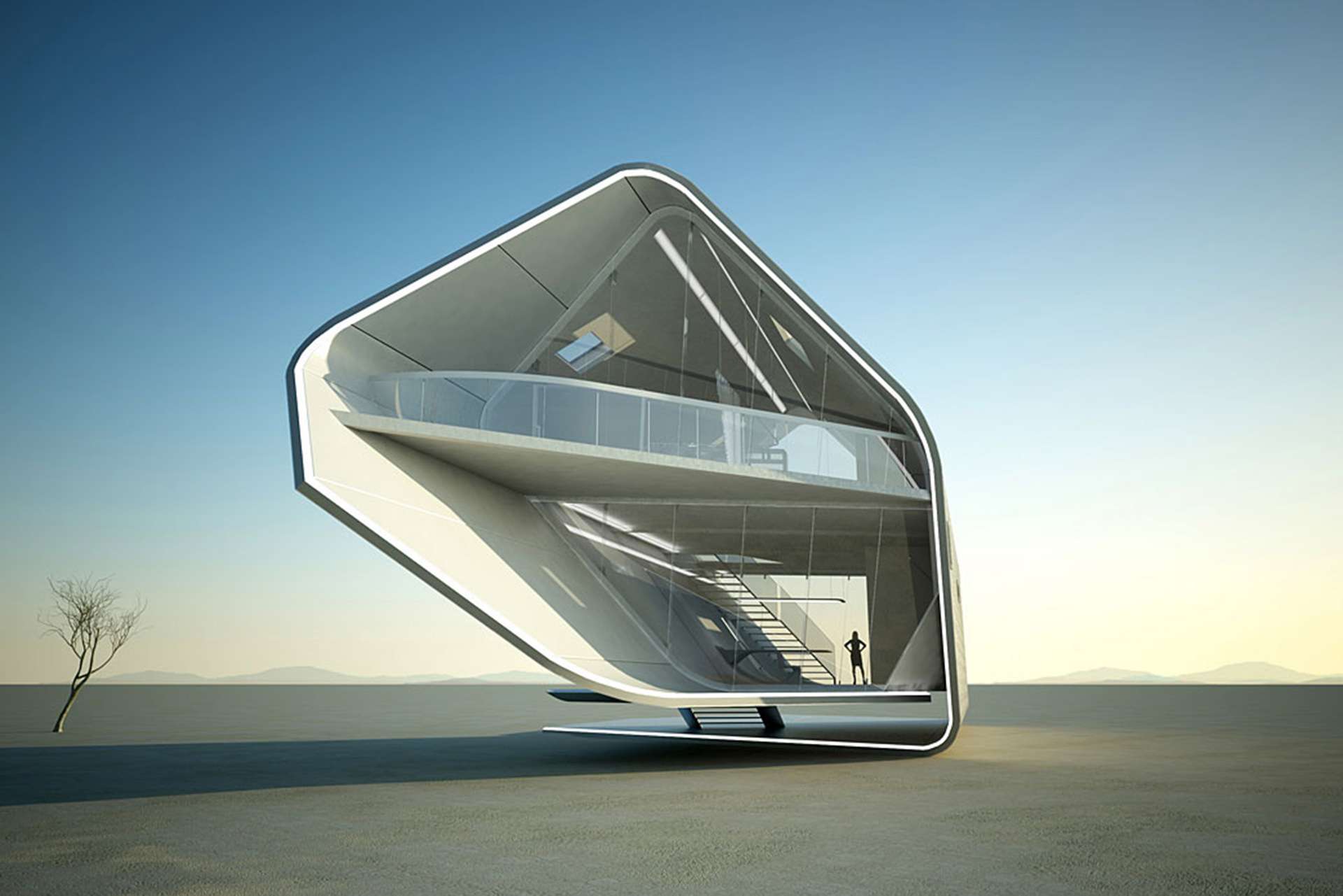Auffällig bei den futuristischen Konstruktionen ist die verspielte Komposition von fantastischem Design und dem Ruf der Natur. Übrig bleibt, gerade durch den vielen Einsatz von Glas und den minimalistischen Ausführungen, das Verschwimmen zwischen Raum und Zeit.