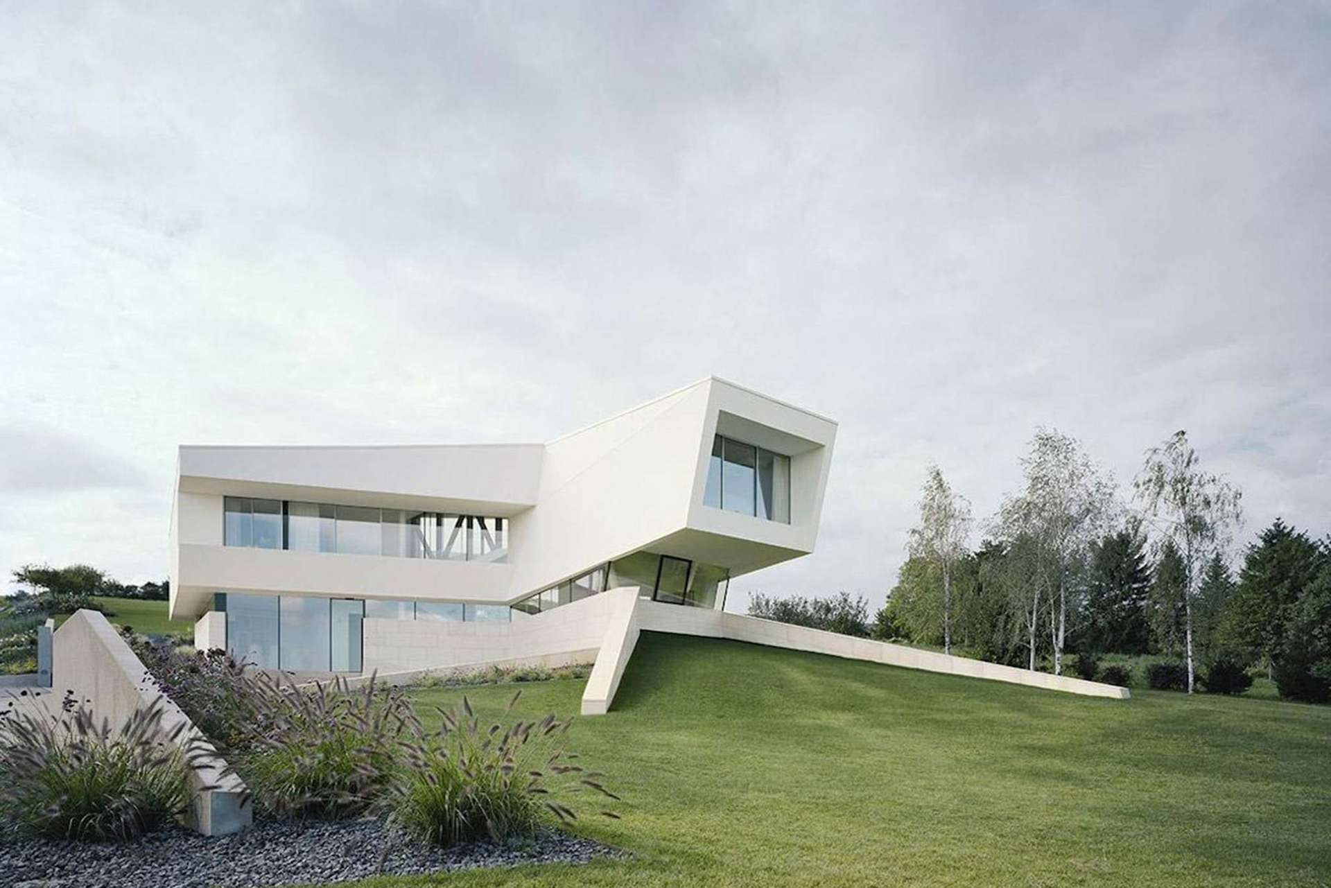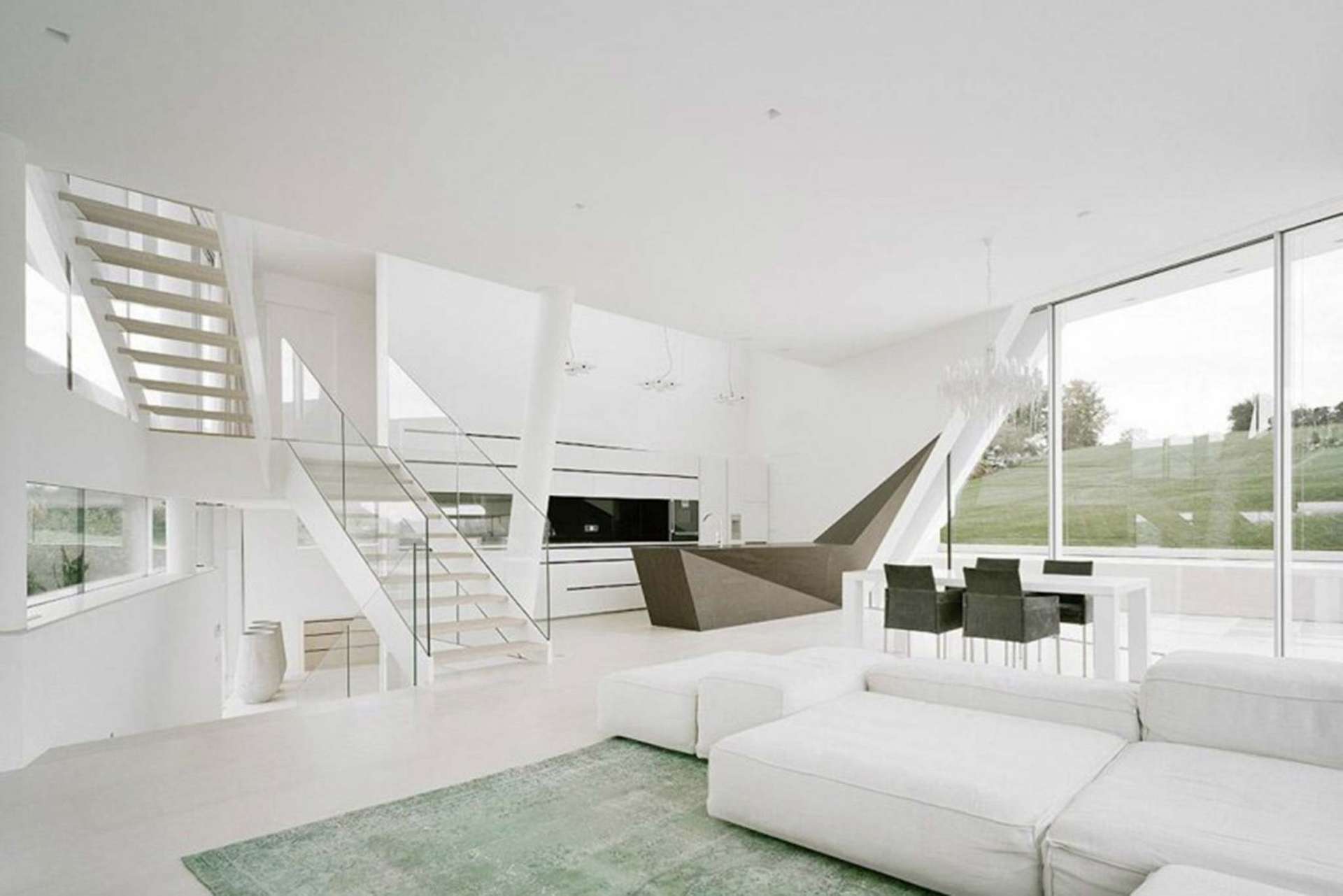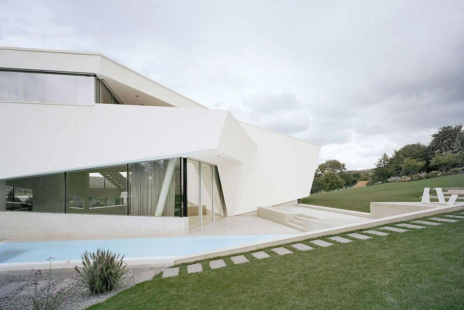 »Ich hätte gerne ein UFO«, äußerte ein anderer Bauherr in Tullnerfeld bei Wien bei der Erstbesprechung seinen Wunsch gegenüber dem Architekturbüro »Project A01« und daraus entstand ein weißes, glatt verputztes Gebilde, das über einem Kalksteinsockel zu schweben scheint. Die champagnerfarbenen Mauern aus portugiesischem und kroatischem Kalkstein dienen dem Split-Level-Haus als visuelle Landekufe im Garten. Darüber entfaltet sich eine weiße Skulptur mit insgesamt 220 Quadratmetern Glasfläche rundherum. Der zwölf Meter lange Pool dient auch einem optischen Zweck: Bei richtigem Sonneneinfall reflektiert er die leichten Wasserbewegungen an der Decke im Innenraum. Durch die imposanten Glasschiebefenster im Innenraum verschwinden die räumlichen Grenzen.